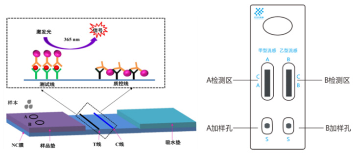 將樣品分別滴加于檢測卡A、B兩個加樣孔,甲型和(或)乙型流感病毒抗原與熒光微球標記的甲型和(或)乙型流感病毒核蛋白單抗結合后,層析到測試線被包被抗體捕獲,在365nm波長紫外照射下,呈現熒光條帶,可通過肉眼判定甲型和(或)乙型流感病毒。