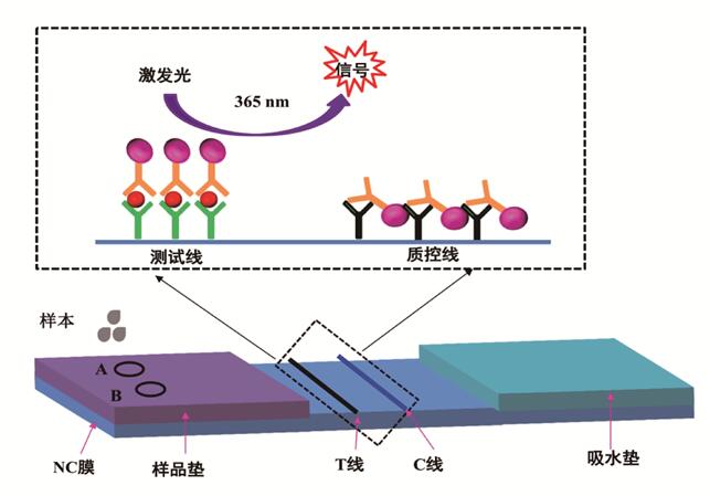 熒光微球標記技術應用膜層析雙抗體夾心法原理檢測樣本中的甲型和(或)乙型流感病毒抗原。檢測時,將處理后的樣品分別滴加于檢測卡A、B 兩個檢測區對應的加樣孔,當樣品中存在甲型和(或)乙型流感病毒時,病毒抗原與量子點納米球標記的甲型和(或)乙型流感病毒核蛋白單抗I結合后,層析到檢測線時,會被包被的甲型和(或)乙型流感病毒核蛋白單抗II捕獲,從而在檢測線位置聚集,形成熒光條帶A線和(或)B線,在波長為365nm 的紫外照射下,可通過肉眼判定結果為甲型和(或)乙型流感病毒陽性,也可通過熒光層析試紙判讀儀判定結果為甲型和(或)乙型流感病毒陽性。
